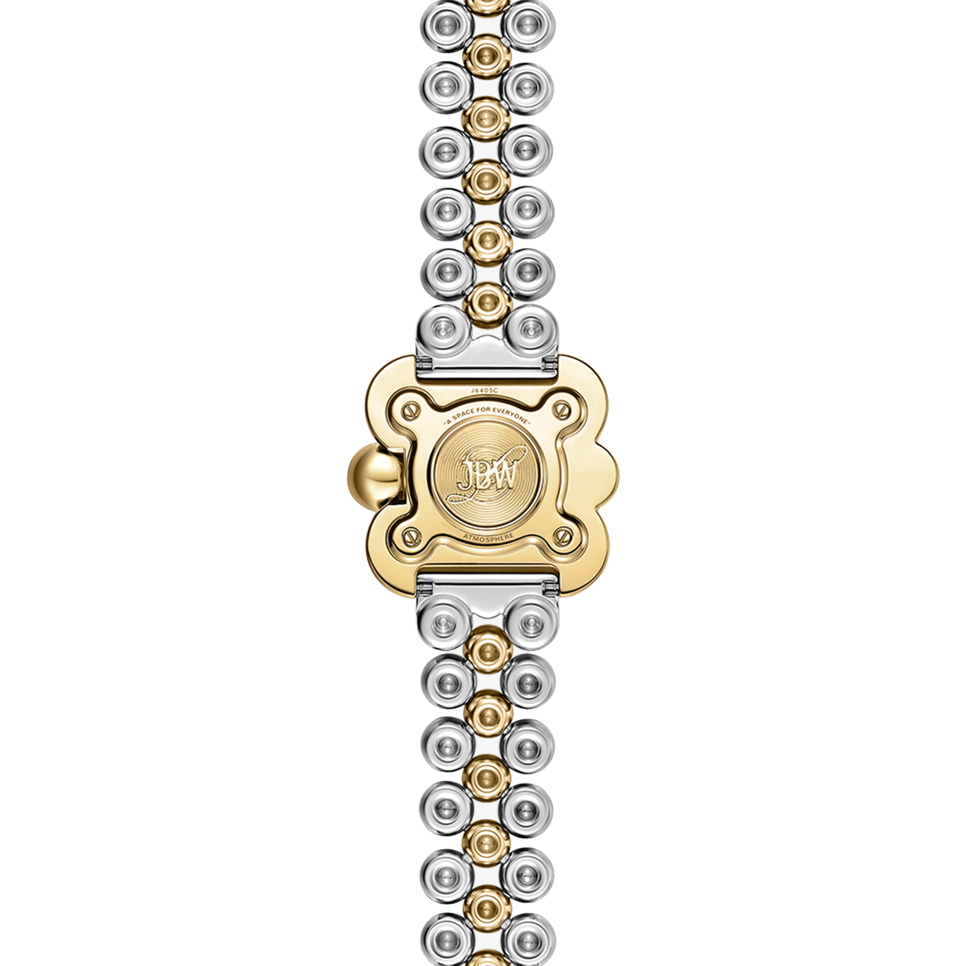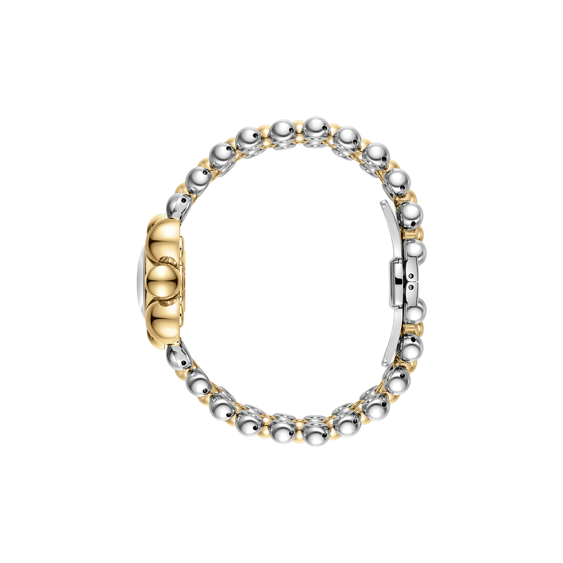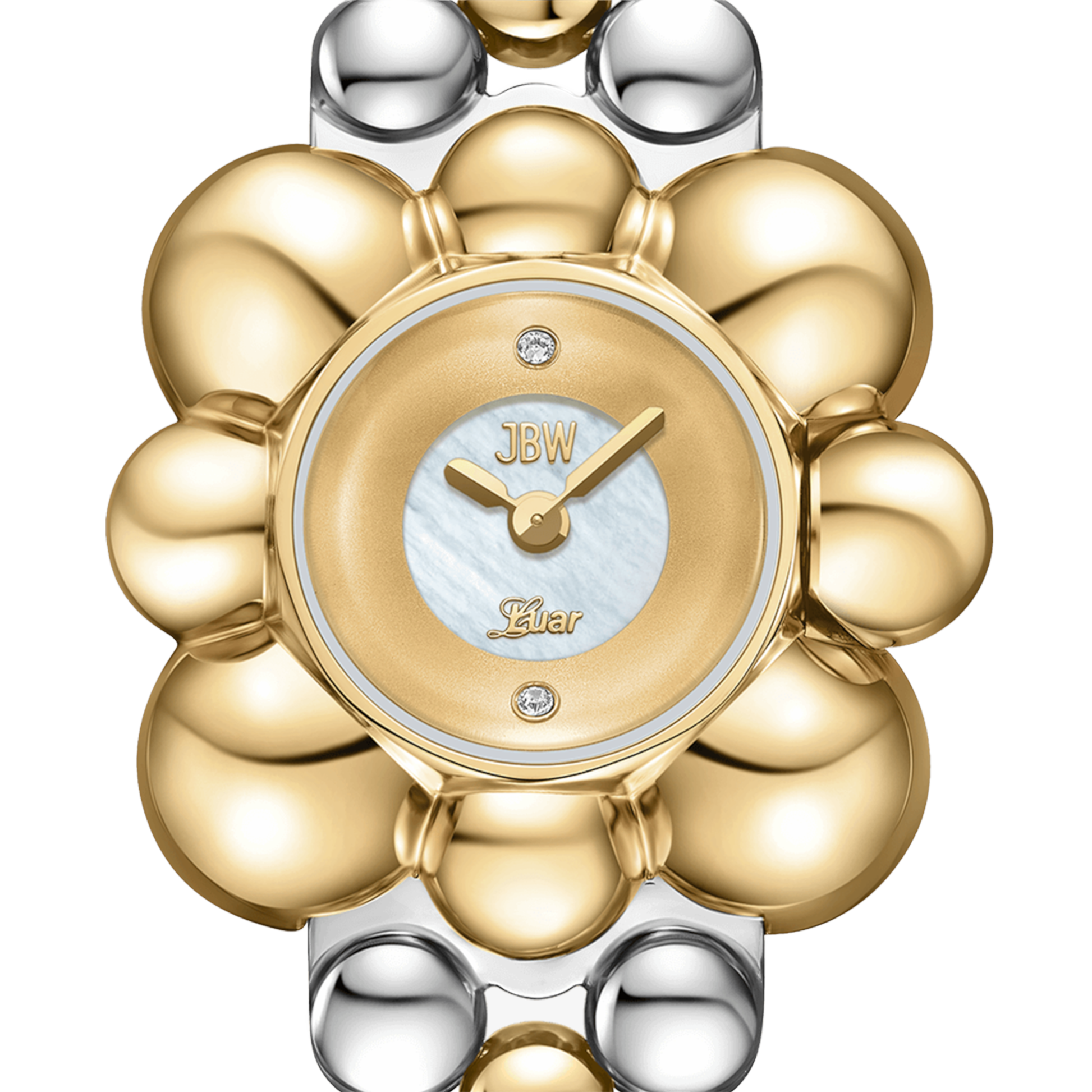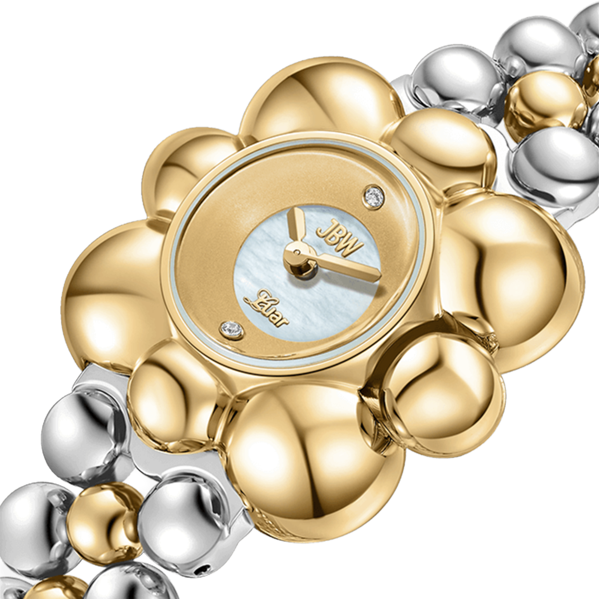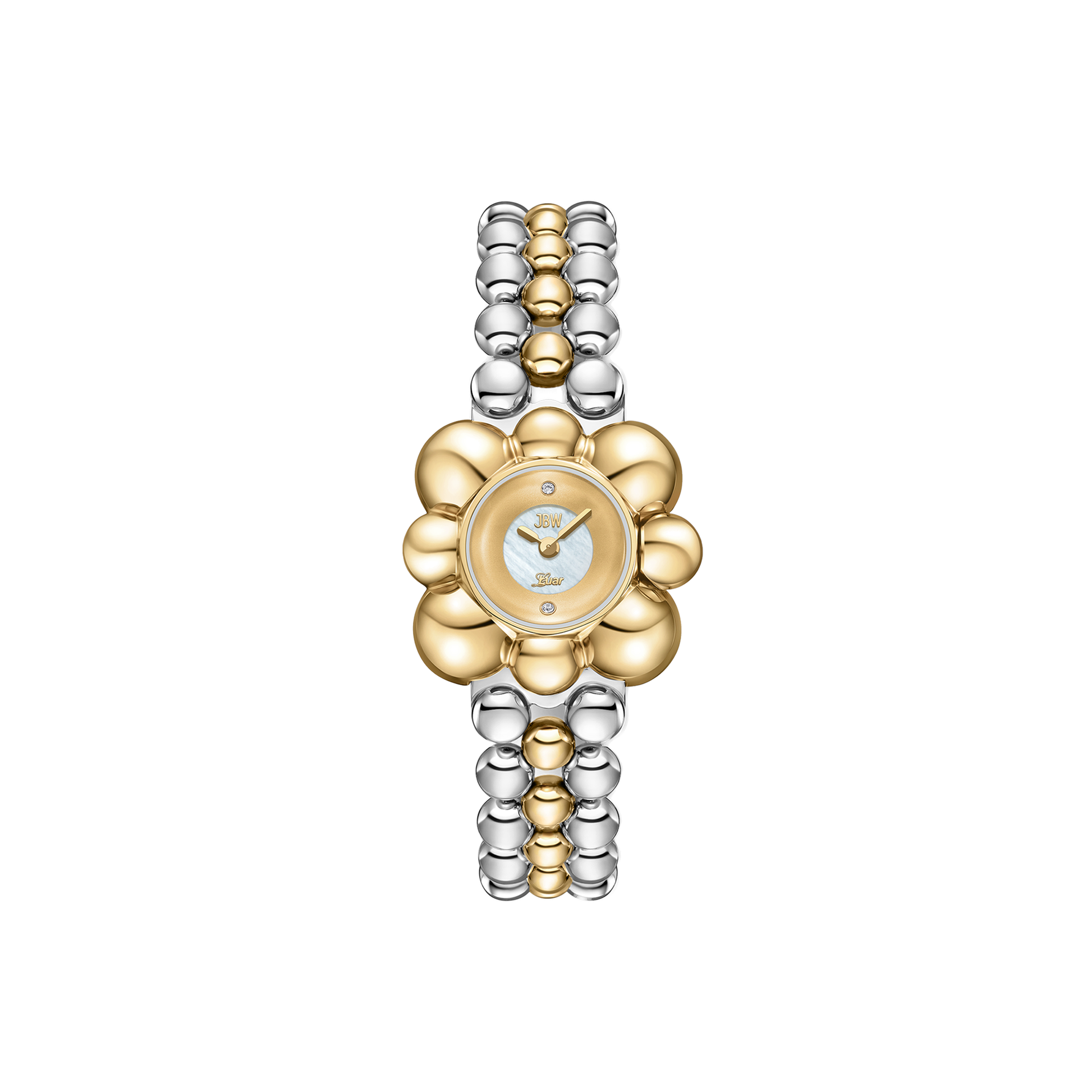 Atmosphere embodies time and space in a spherical jewelry design, reflecting light from any angle. The timepiece is crafted in stainless steel and 18k gold-plating, grounded by a sleek mother of pearl dial and adorned by two lab-grown diamonds at 6 and 12 o'clock. The curvature of the 30mm case is mirrored through the 16mm bracelet that seamlessly orbits the wrist in a lustrous finish.