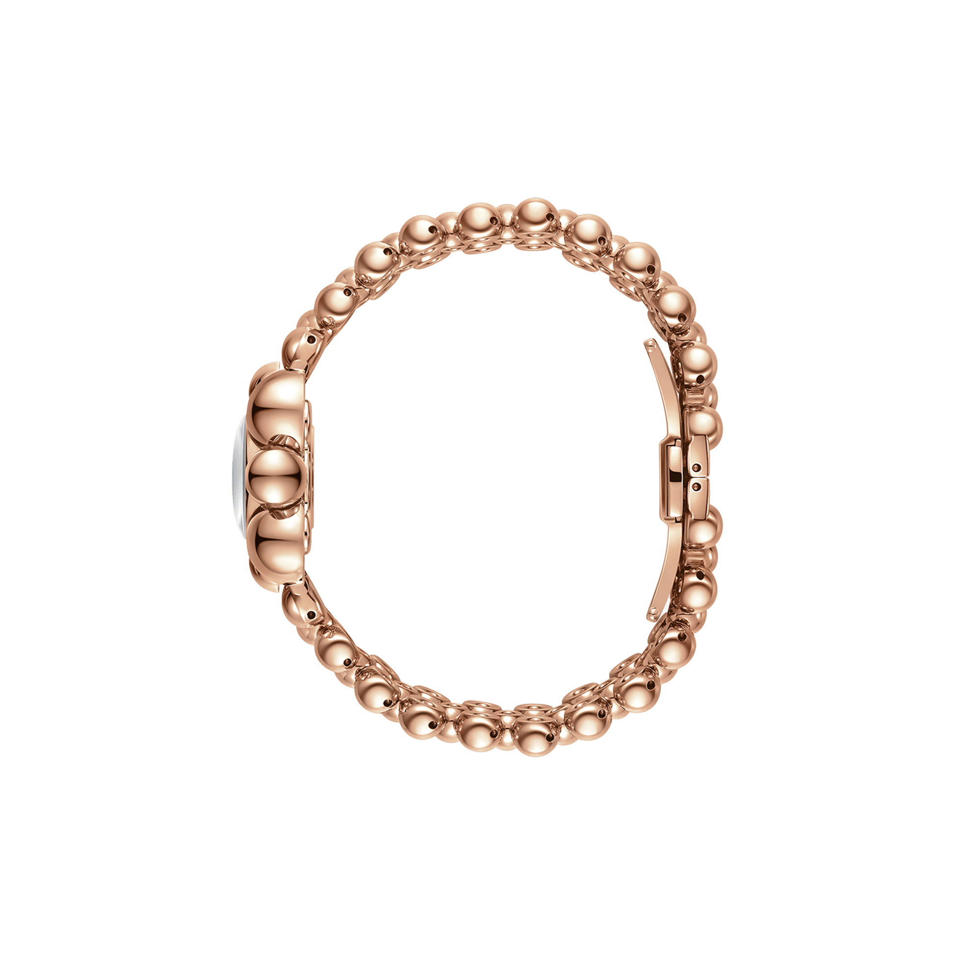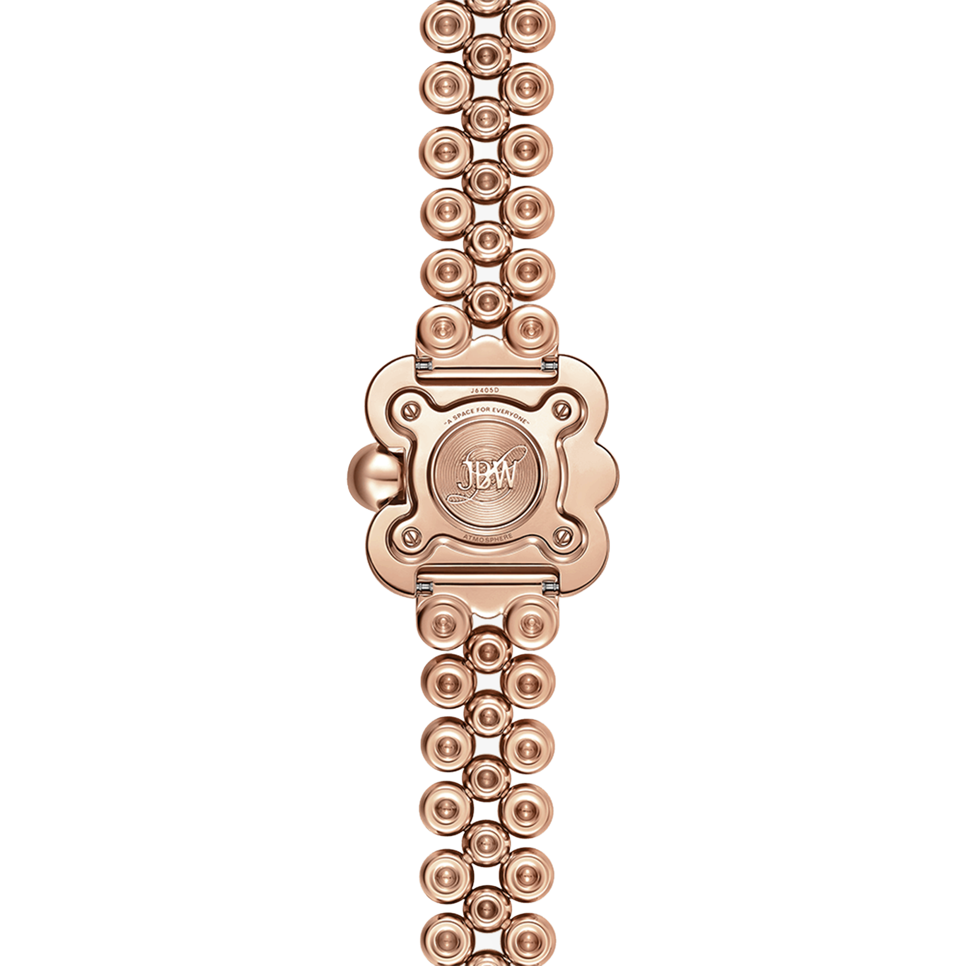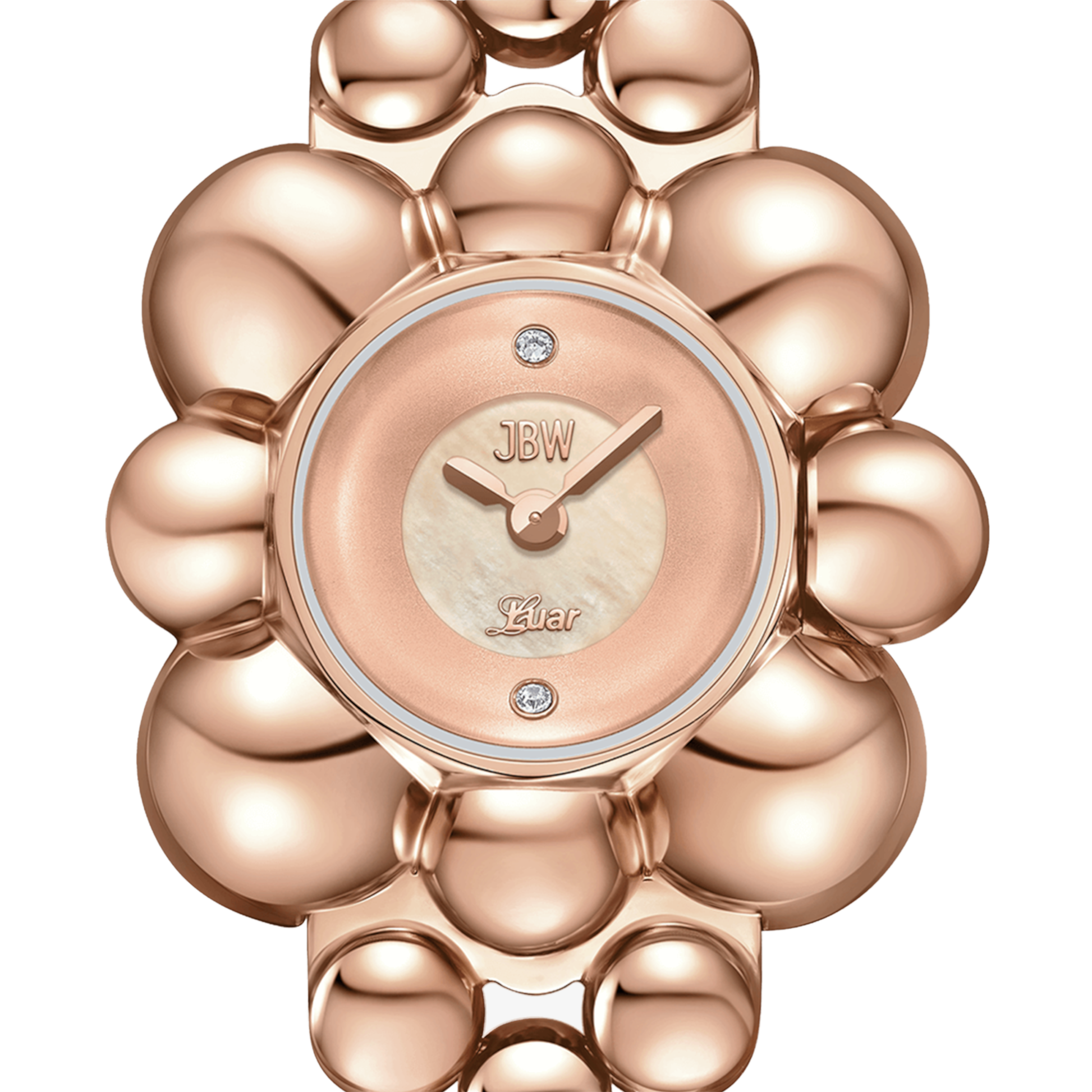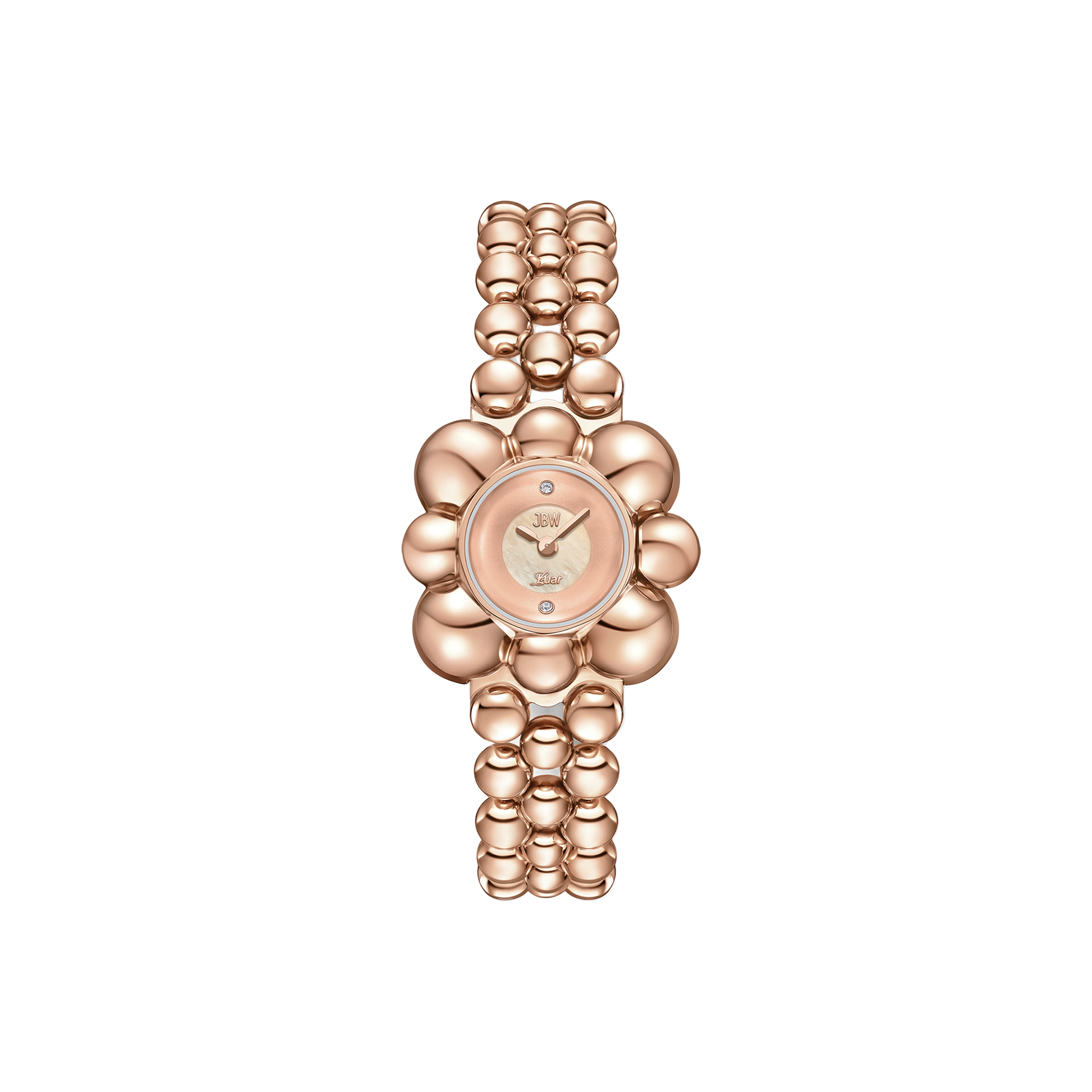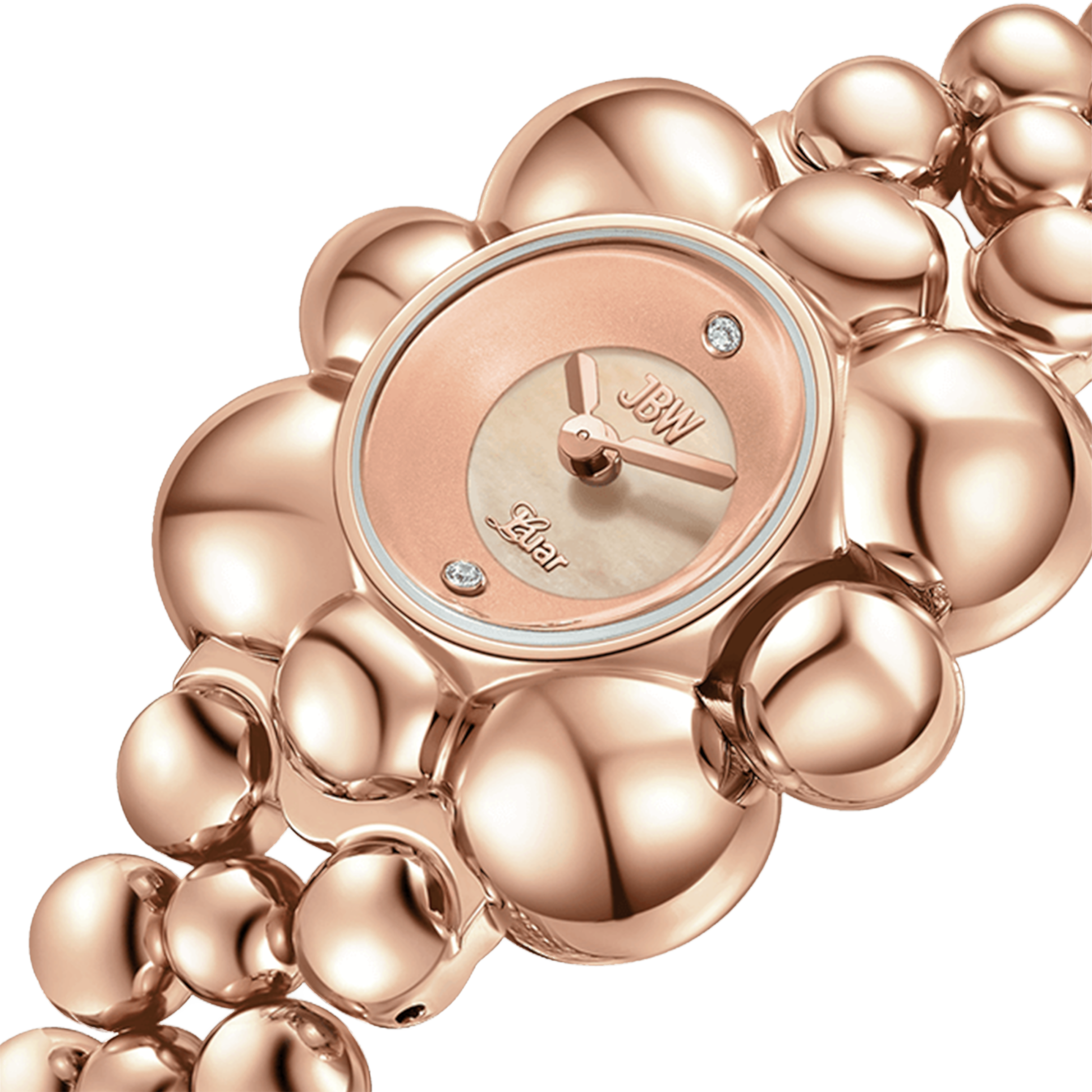 Atmosphere embodies time and space in a spherical jewelry design, reflecting light from any angle. The timepiece is crafted in 18k rose gold-plating and grounded by a sleek mother of pearl dial, adorned by two lab-grown diamonds at 6 and 12 o'clock. The curvature of the 30mm case is mirrored through the 16mm bracelet that seamlessly orbits the wrist in a lustrous finish.