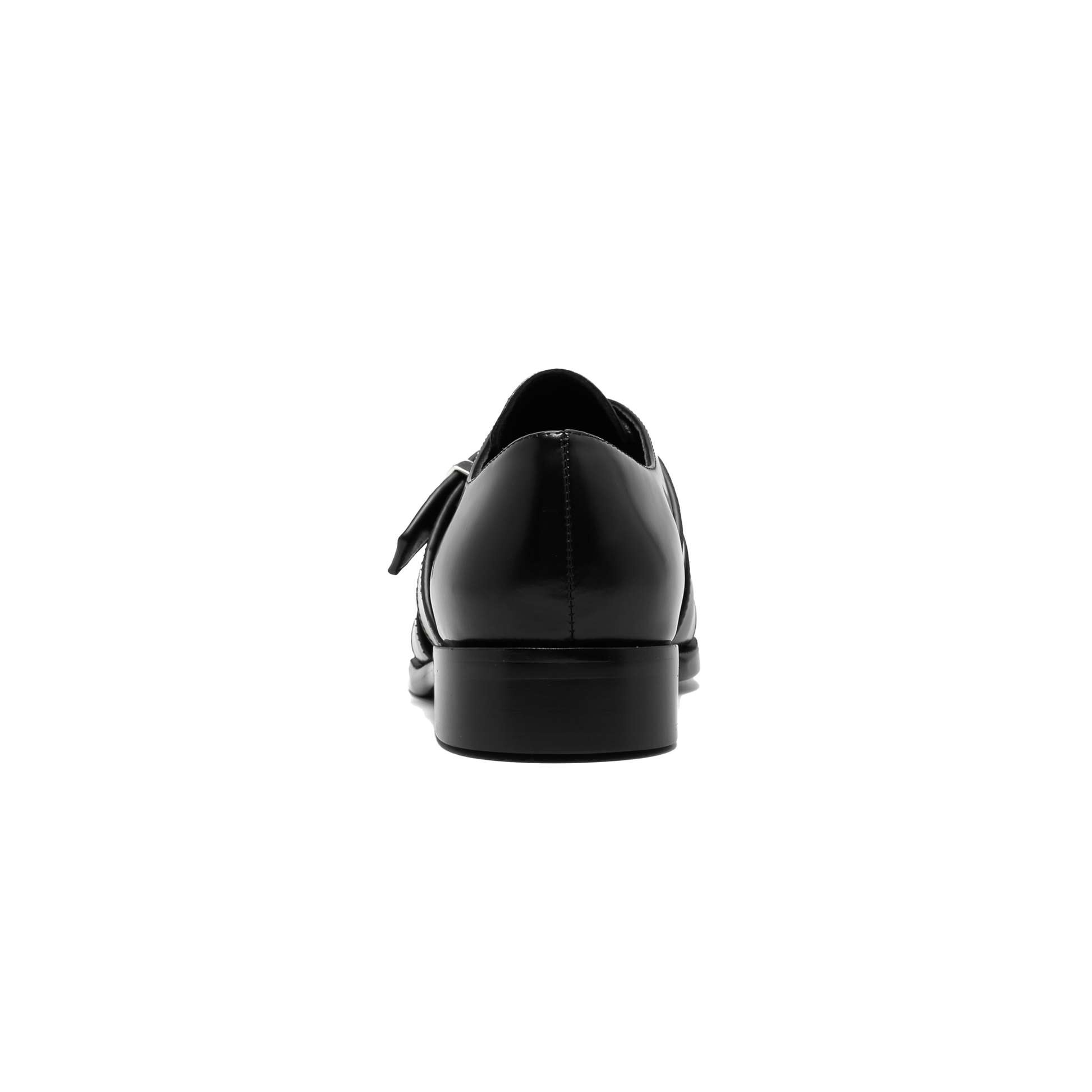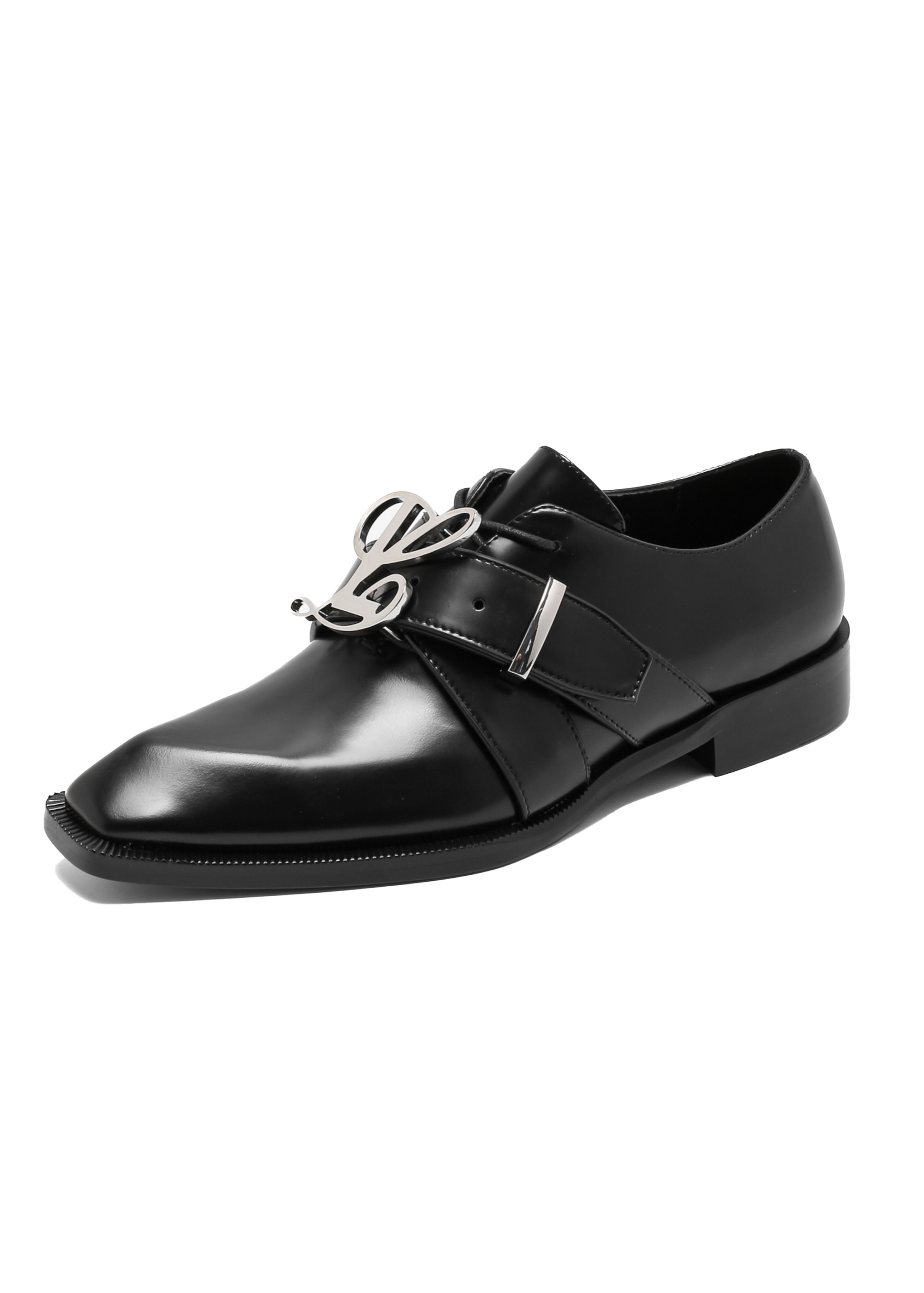 This lace-up shoe boasts a sleek leather construction, highlighted by a distinctive belted vamp adorned with LUAR's signature L logo buckle in anti-rust stainless steel.