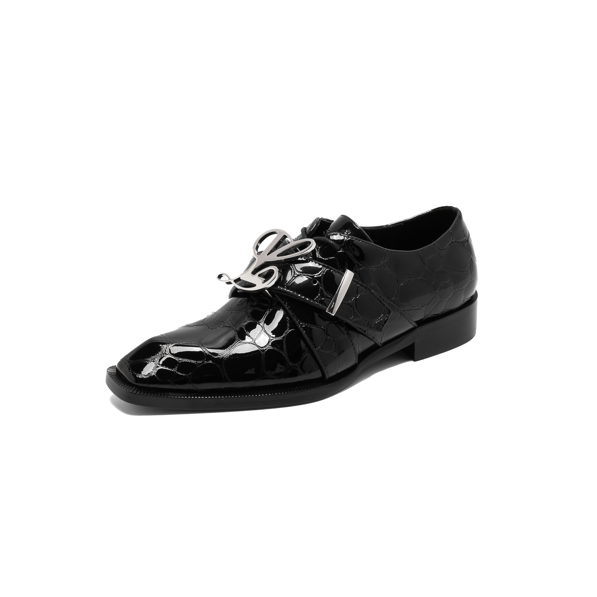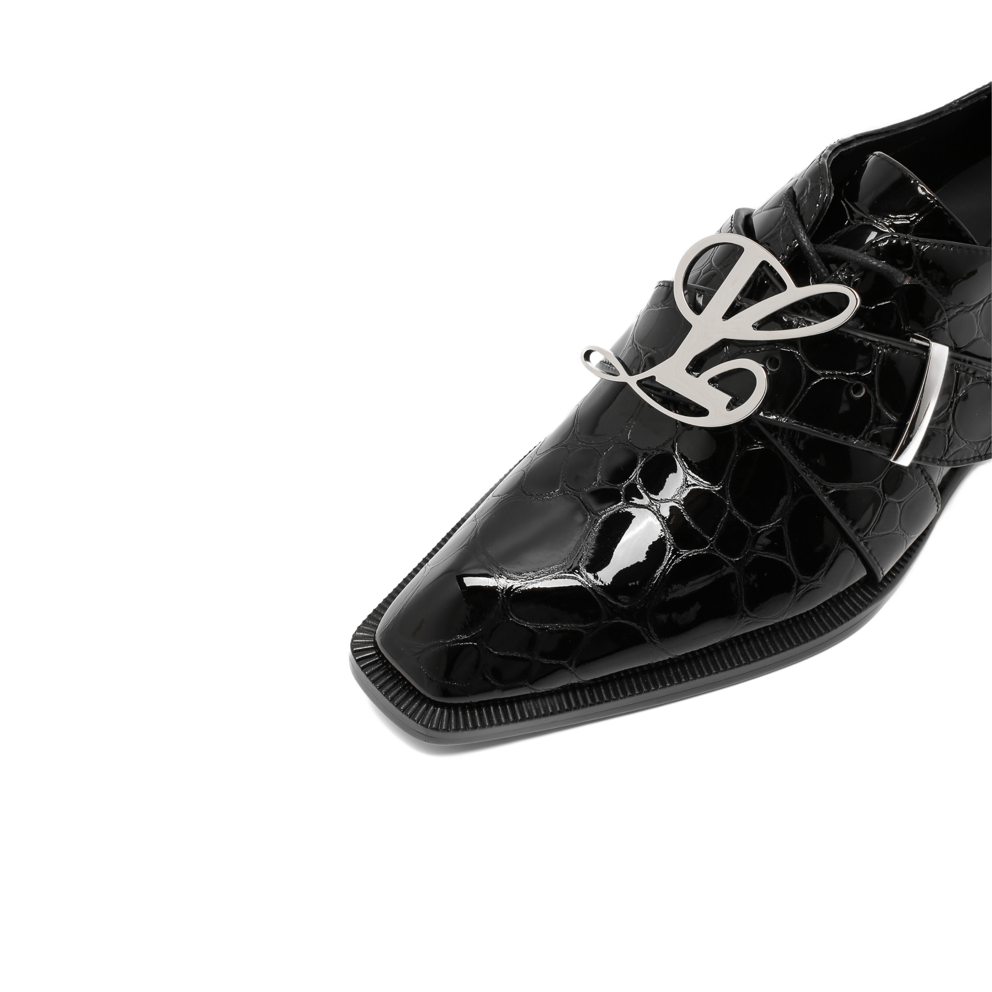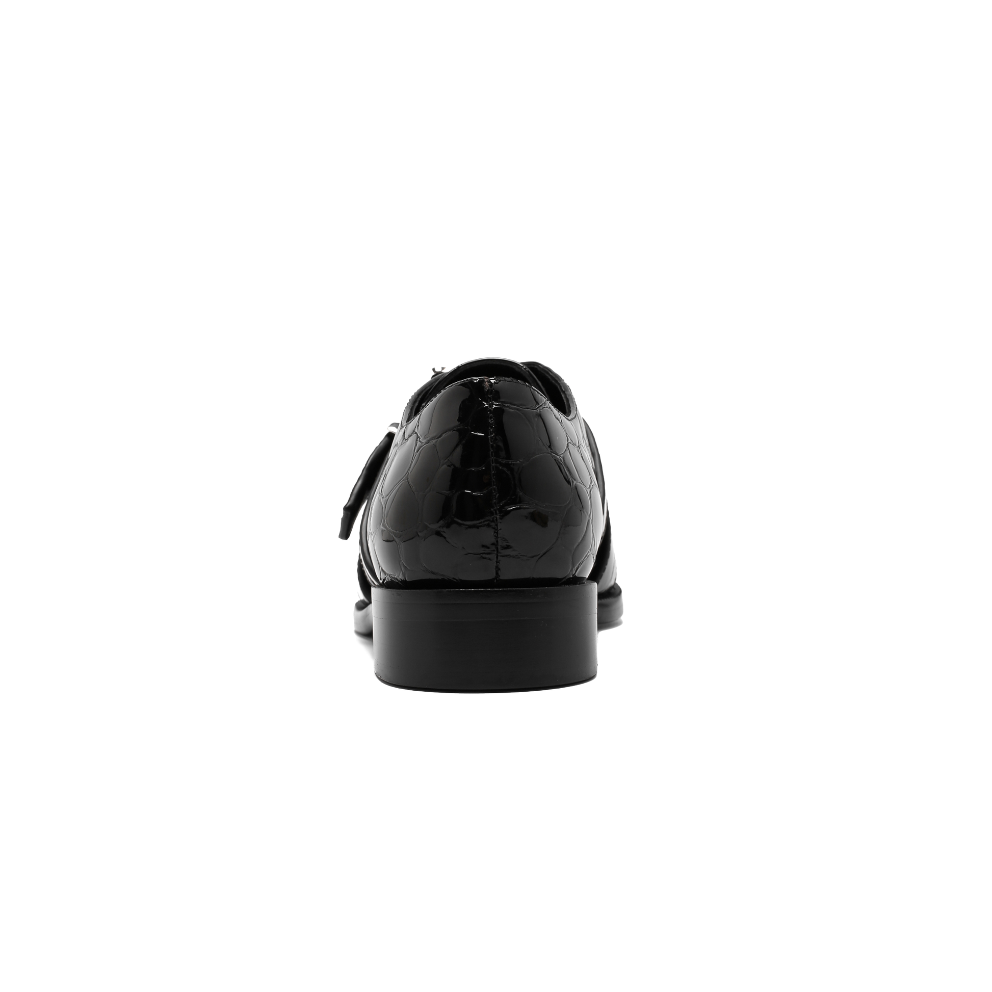 This lace-up shoe boasts a sleek leather construction, highlighted by a distinctive belted vamp adorned with LUAR's signature L logo buckle in anti-rust stainless steel.