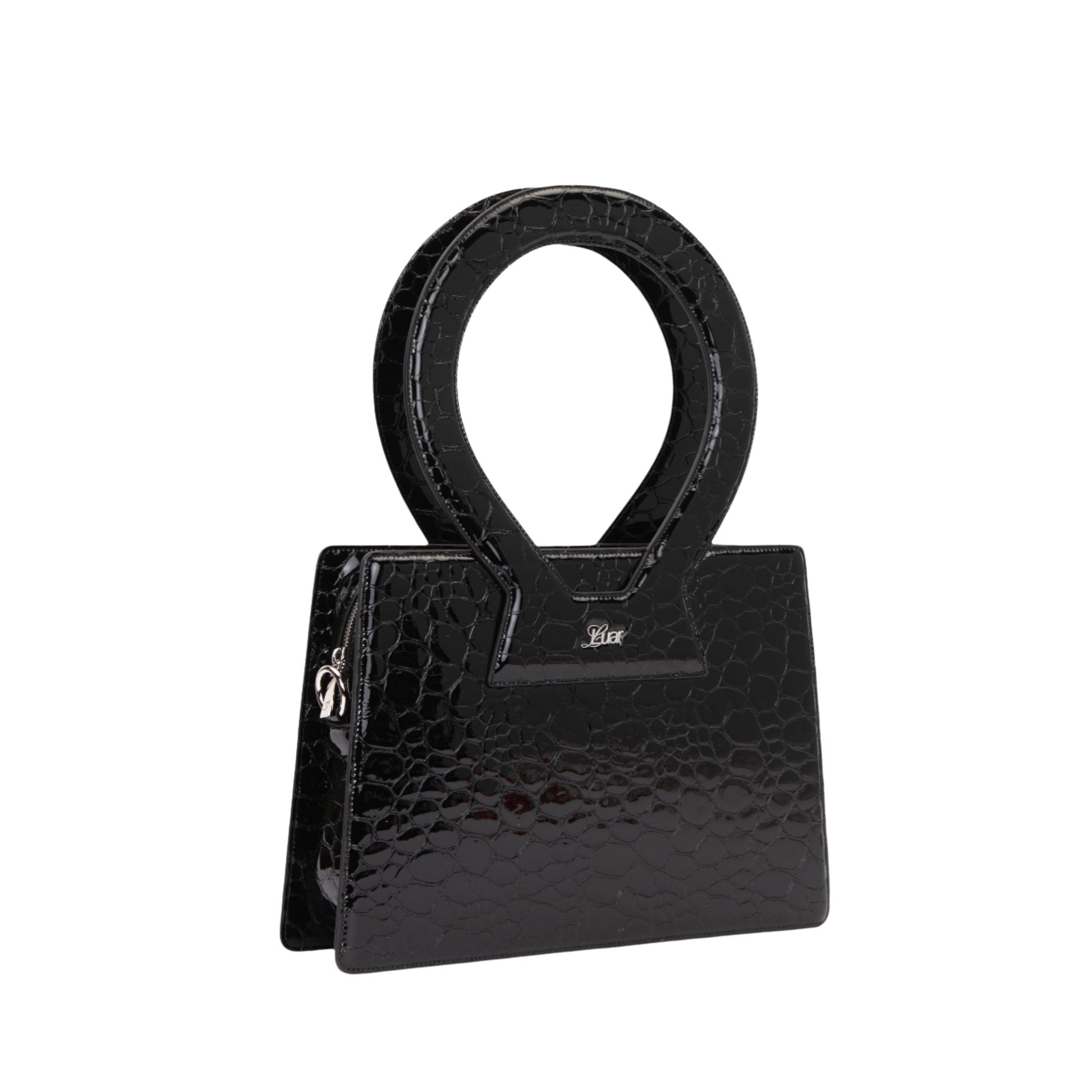 The LUAR Black Pebble Large Ana Bag. Crafted from shiny embossed leather, it features a signature circle top handle and a removable crossbody strap. Accented with a logo engraving and silver hardware, this miniature bag makes a bold statement.