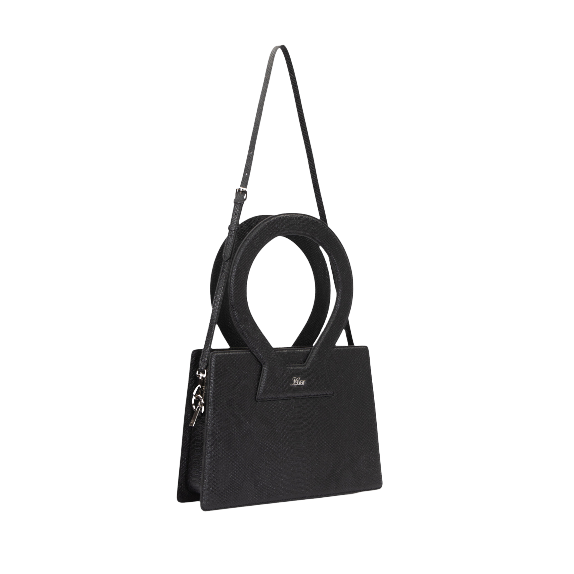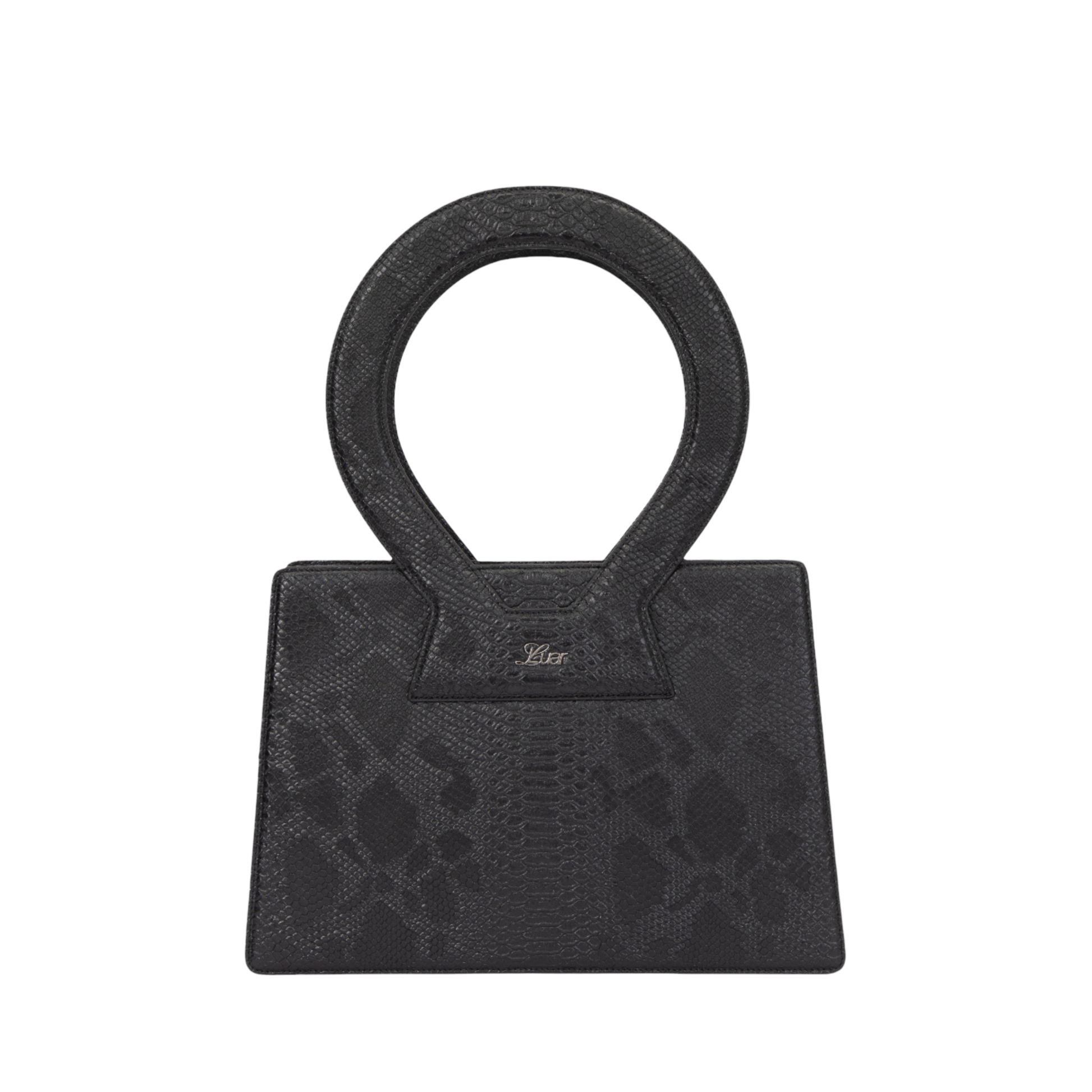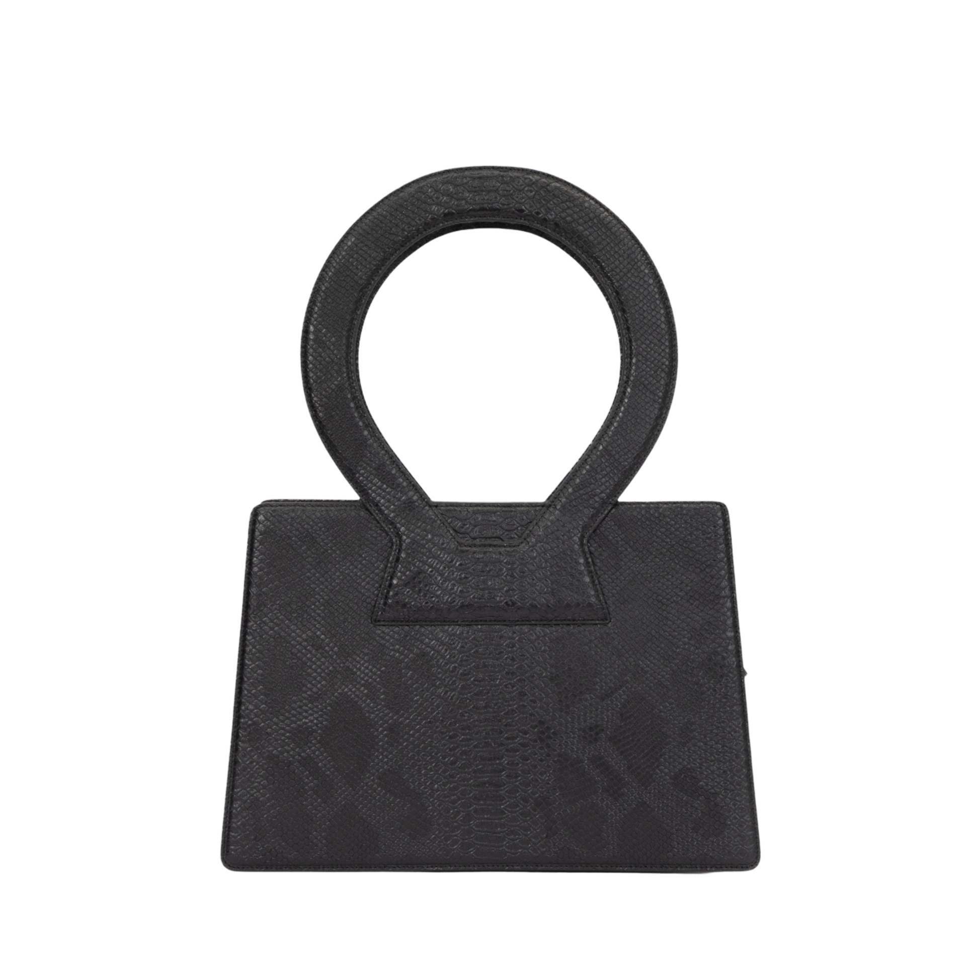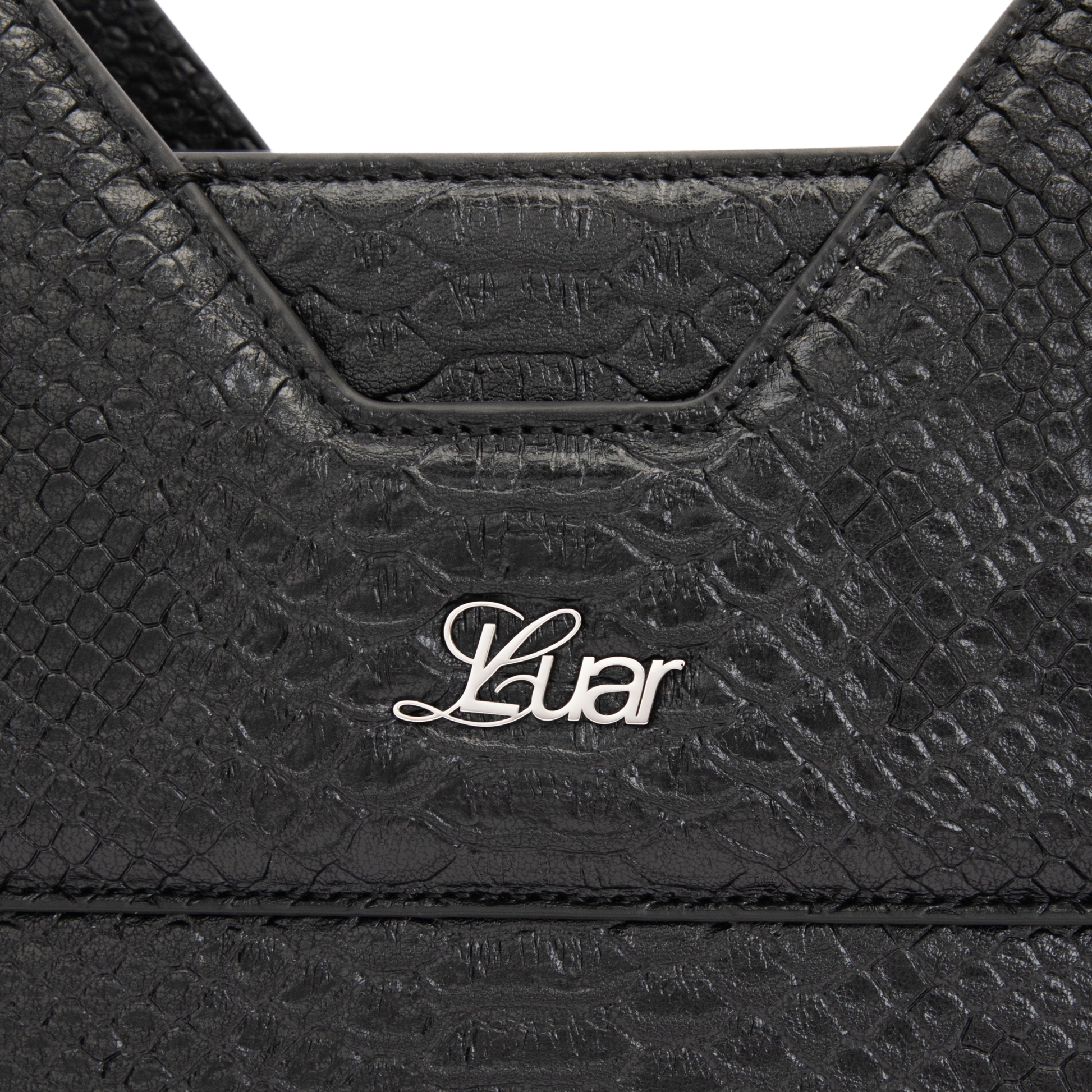 The LUAR Black Python Large Ana Bag. Crafted from python embossed faux leather, it features a signature circle top handle and a removable crossbody strap. Accented with a logo engraving and silver hardware, this miniature bag makes a bold statement.