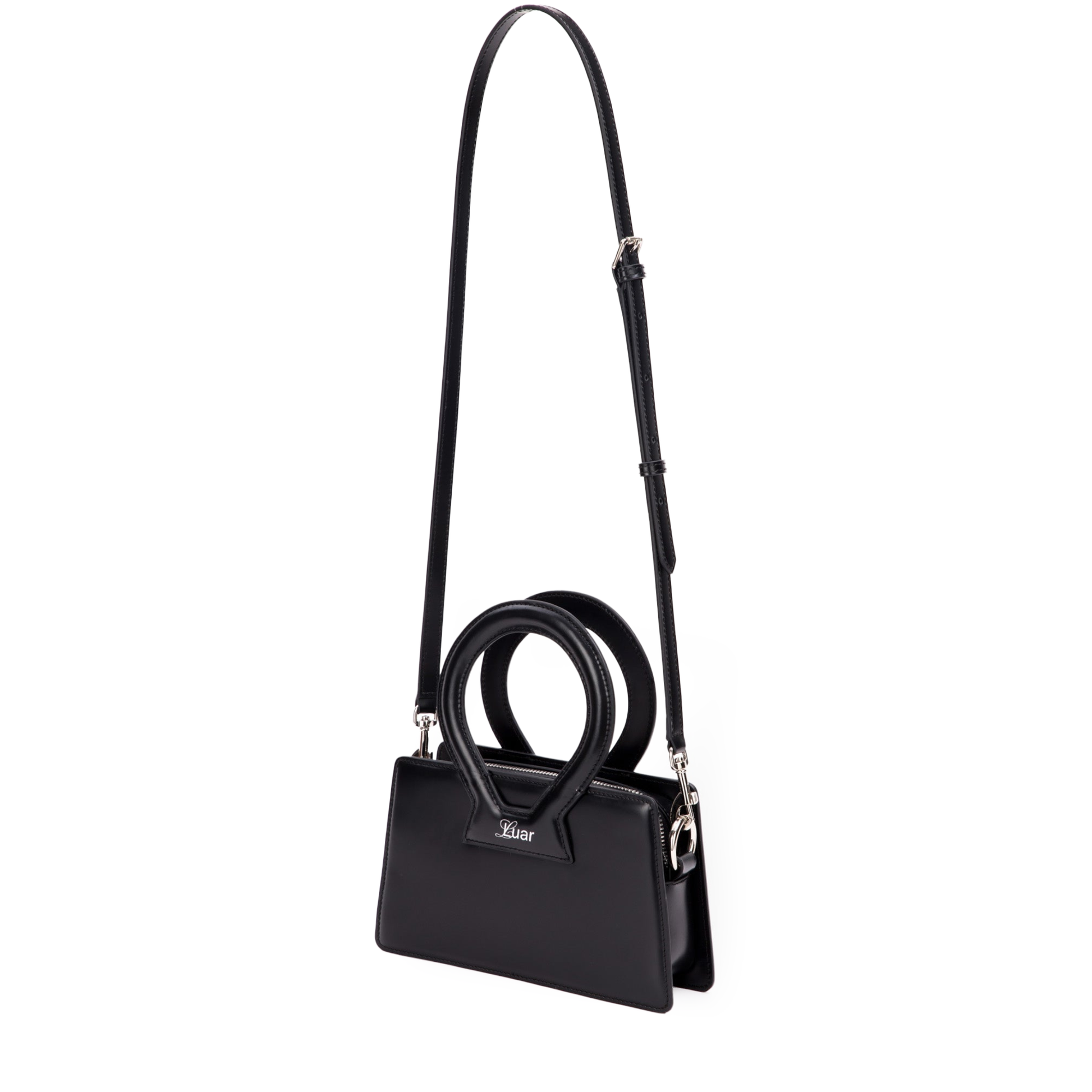 The LUAR Black Small Ana Bag is a signature core classic. Crafted from shiny leather, it features a signature circle top handle and a removable crossbody strap. Accented with a logo engraving and silver hardware, this miniature bag makes a bold statement.
