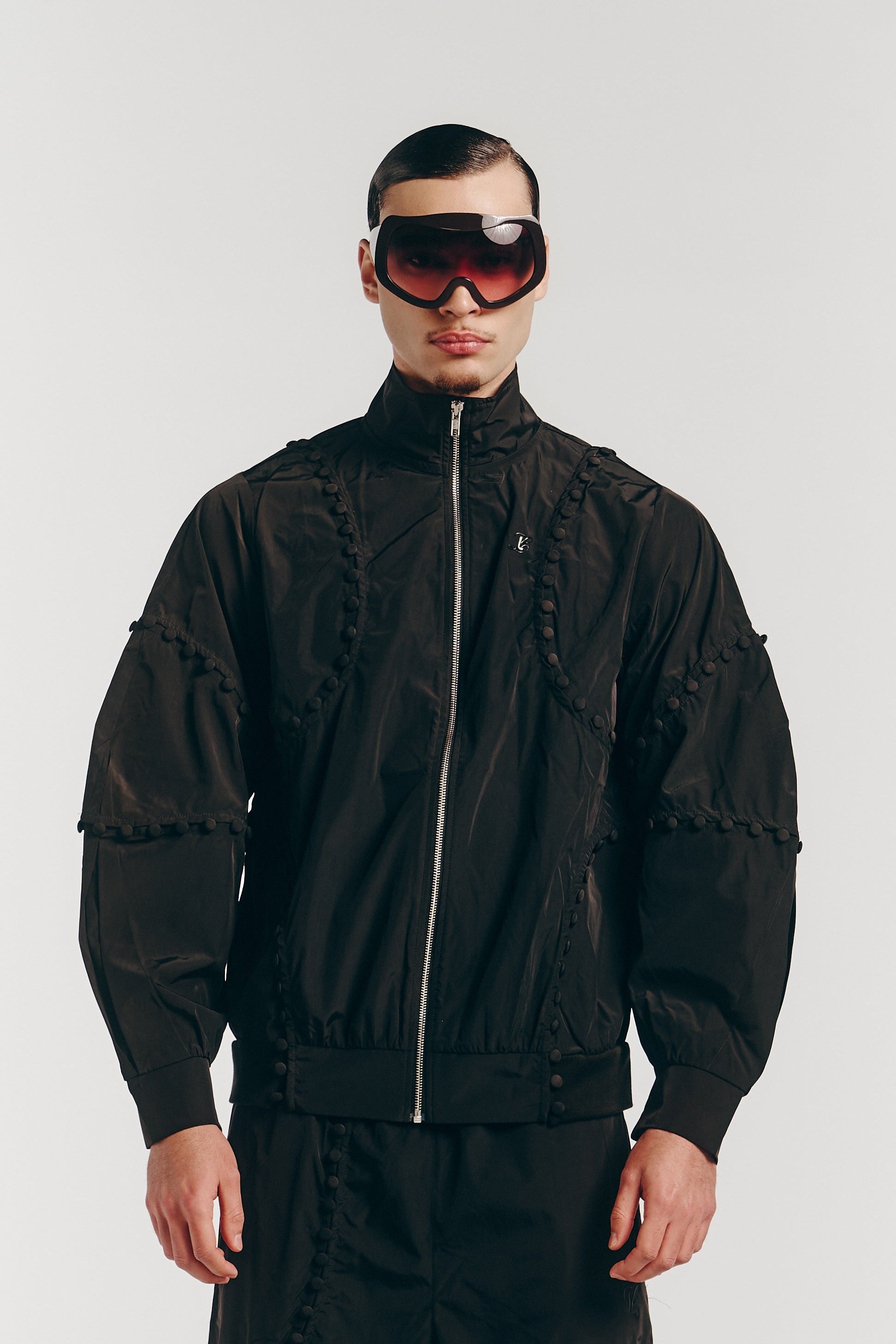 Unbutton Track Jacket in Black Nylon. A study in functional minimalism, the Unbutton Track Jacket is crafted from premium nylon with a sleek, lightweight drape. Fully functional buttons allow for customizable fit and styling, while a zip-up front, long sleeves, and a modern funnel neck provide clean, considered structure. Designed for versatility, the jacket transitions effortlessly between streetwear and activewear.