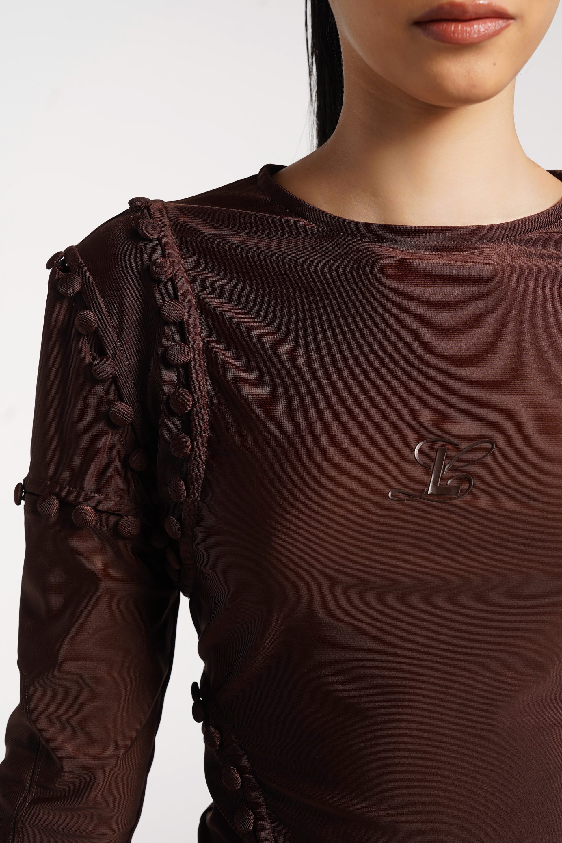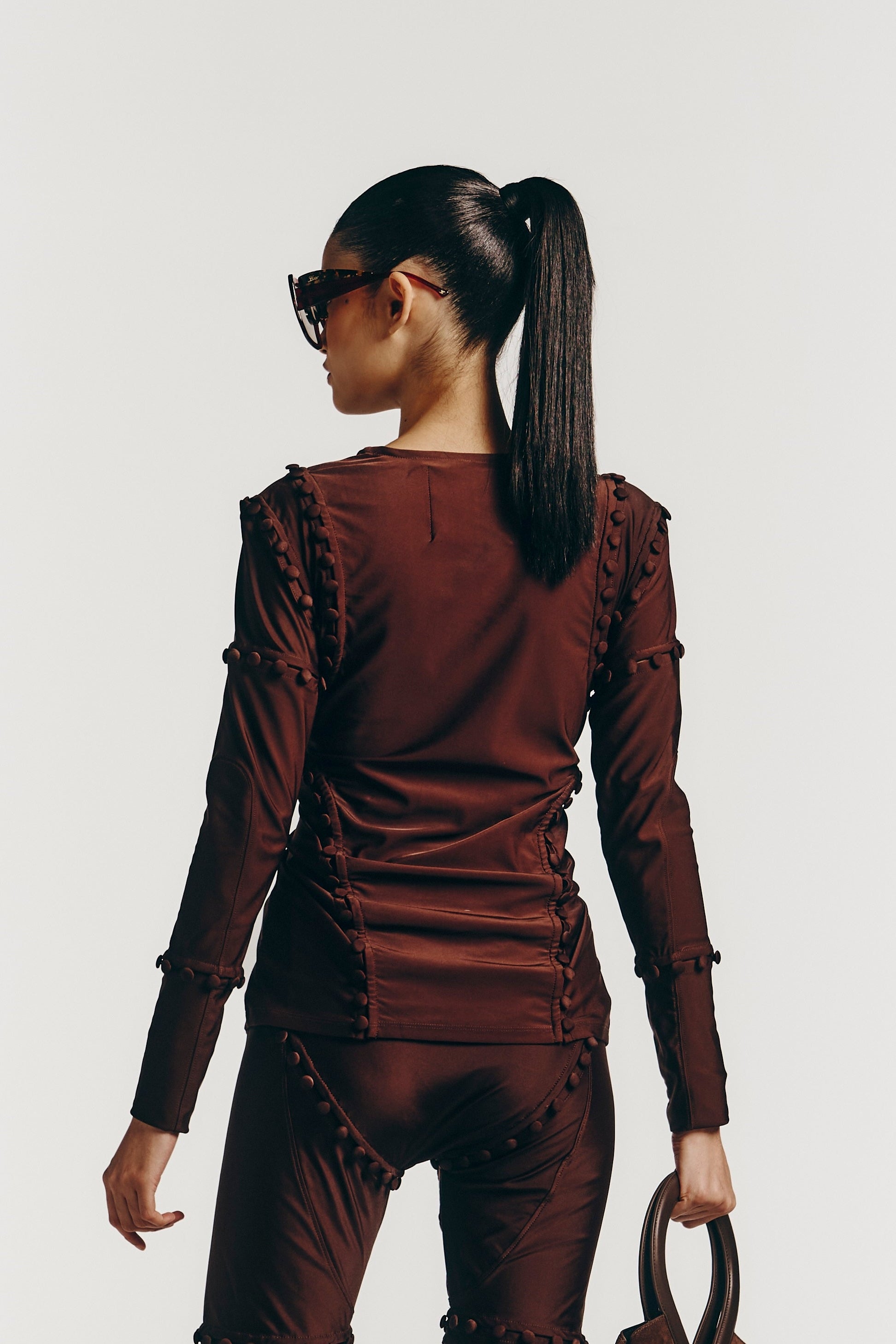 Unbutton Lycra Top in Brown. A study in adaptive design, the Long Sleeve combines movement with sleek minimalism transformed by fully functional buttons along the sleeves and body allow the top to transform into short sleeves, half sleeves, or a tank. Crafted from premium Lycra for a smooth, body-conscious fit and designed for versatility, it transitions effortlessly from activewear to elevated styling.