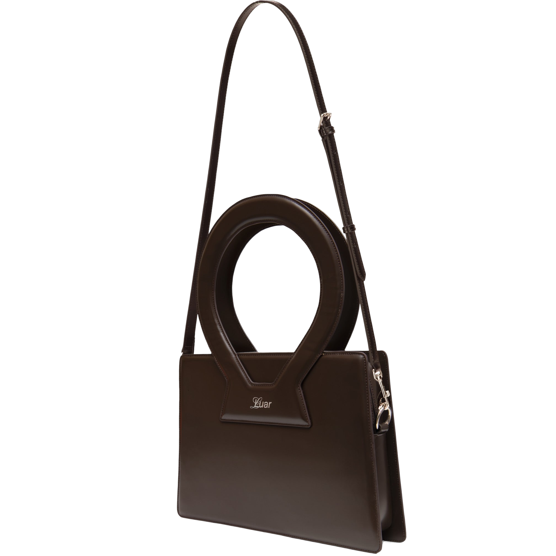 The LUAR Espresso Large Ana Bag is a signature core classic. Crafted from shiny leather, it features a signature circle top handle and a removable crossbody strap. Accented with a logo engraving and silver hardware, this miniature bag makes a bold statement.