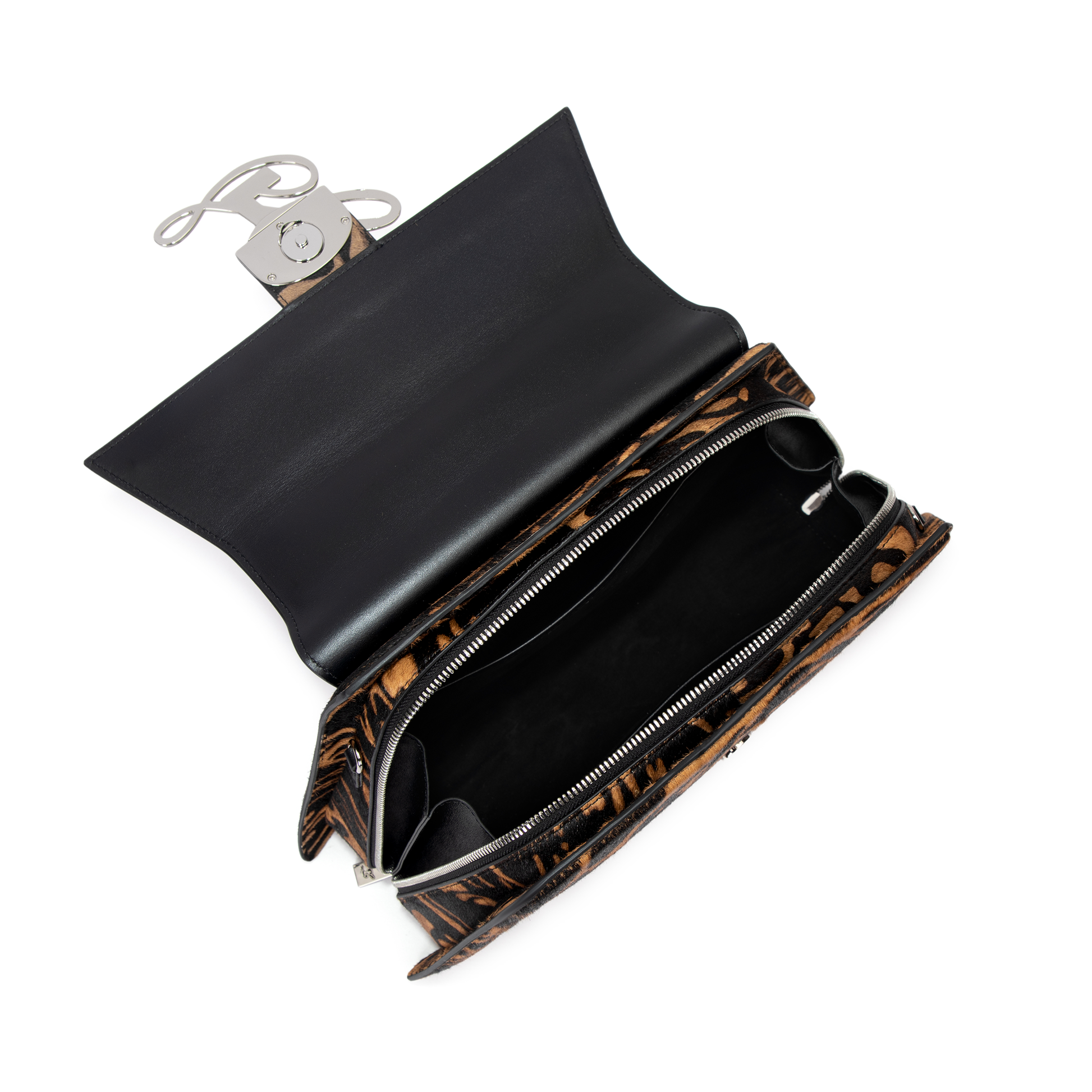 Defined by its structured trapezoidal form, the Yahaira opens from the top to reveal a spacious interior suited to daily essentials and beyond. The signature LUAR handle is refined for an easy hand carry, while a detachable crossbody strap offers understated versatility. A statement stainless-steel LUAR logo magnetic closure secures the silhouette with a clean, sculptural finish. Rendered in leopard pony hair, it balances bold texture with timeless restraint.